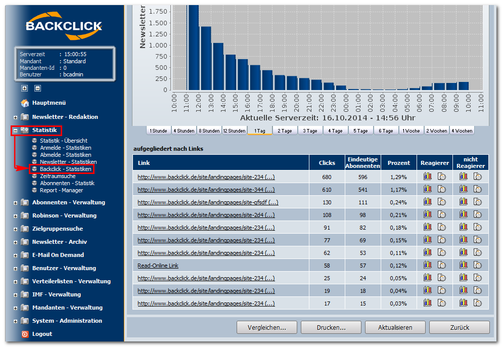 Um die Auswertung dieser Daten in BACKCLICK anzuzeigen, wechseln Sie bitte in das Stastistik Menü Statistik --> BackClick-Statistiken. Hier finden Sie zunächst eine tabellarische Aufstellung der jeweils letzten Aussendungen einer Verteilerliste.